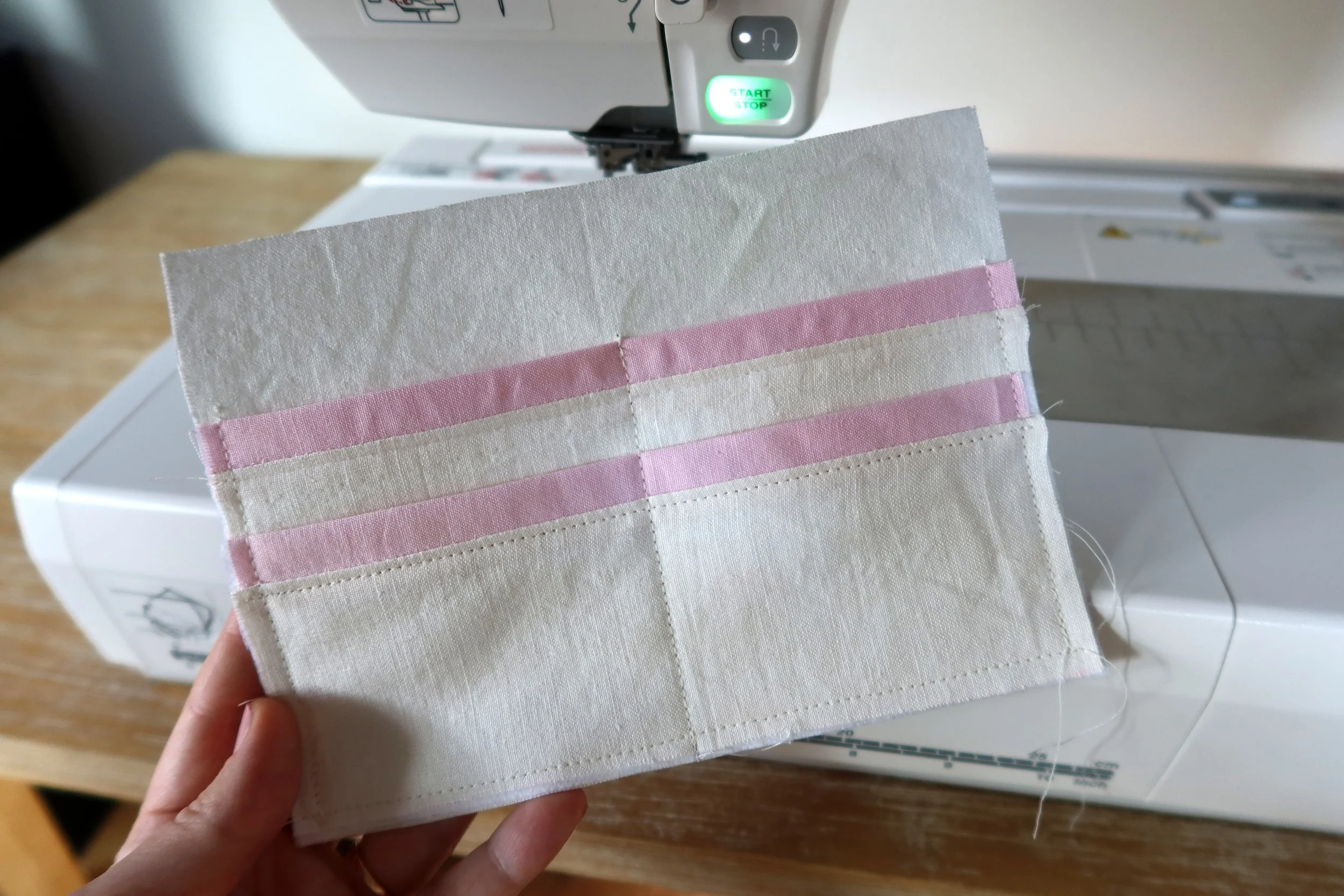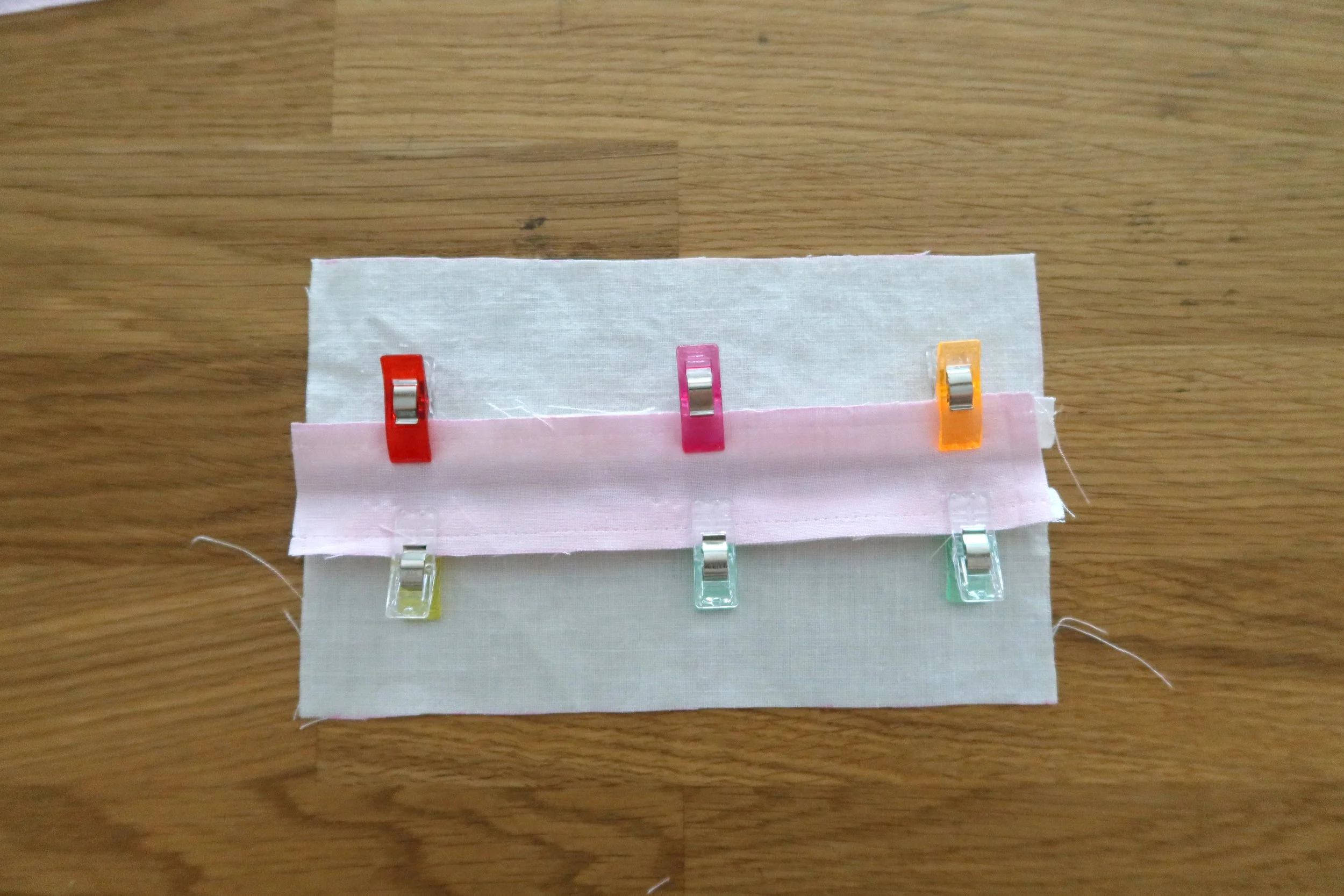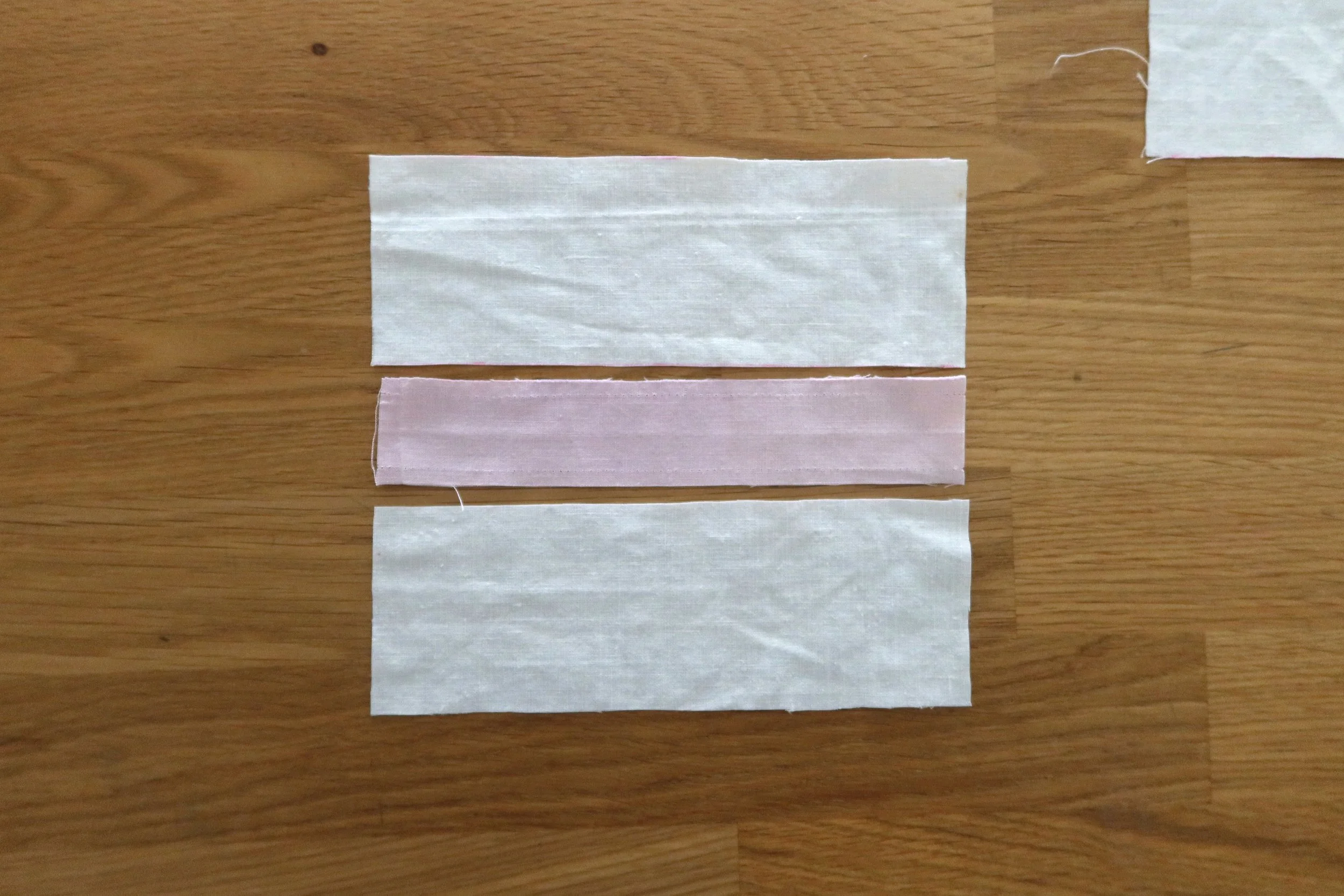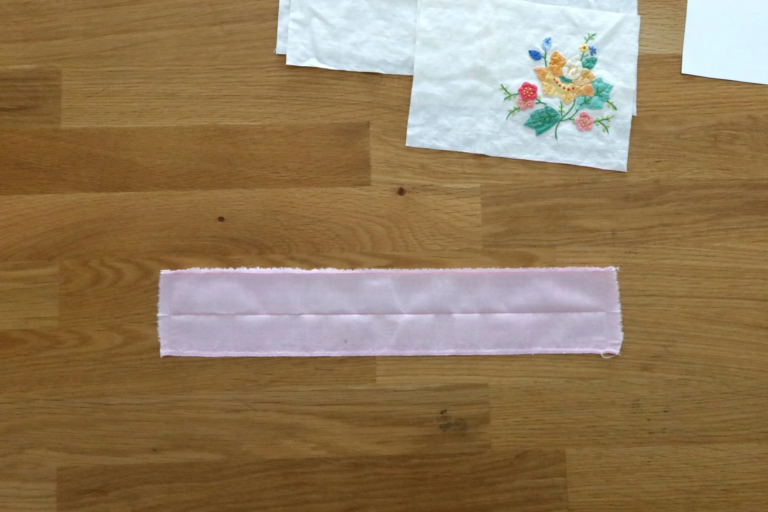 My napkin has a light pink folded edge attached to it, which I removed to add to my project as a decorative edge on the interior pockets. This step is optional, but if you have a similar napkin, this is a cute addition. You can use any coordinating fabric for this.