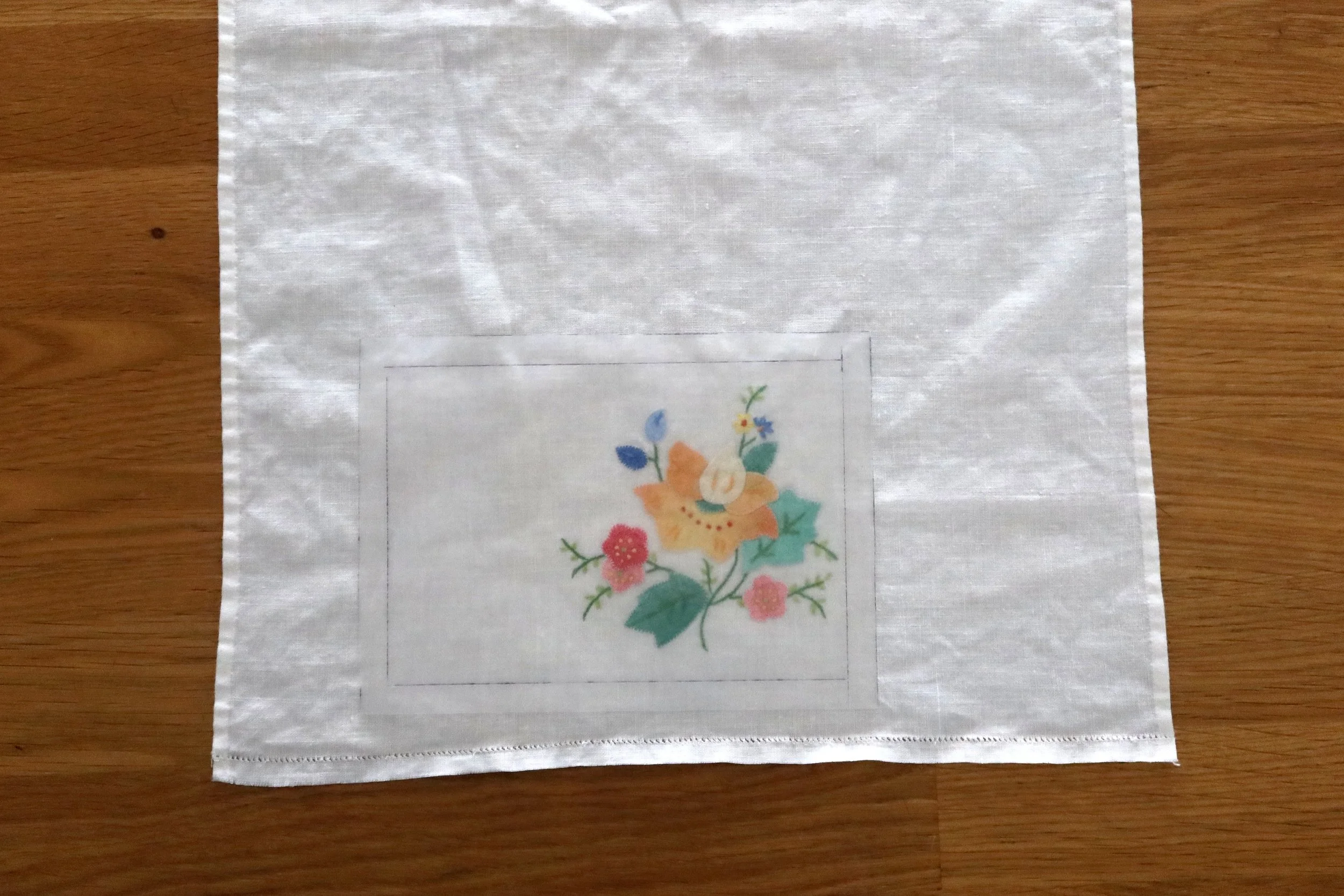When working with an embroidered design, I make a pattern piece out of wax or tracing paper, to better see where the design will sit on the final project. Add the seam allowance outline. It can also be helpful to mark the fold of the wallet so you can see where the design will sit on front and back. My full pattern piece measures 7.25” x 5.25”.