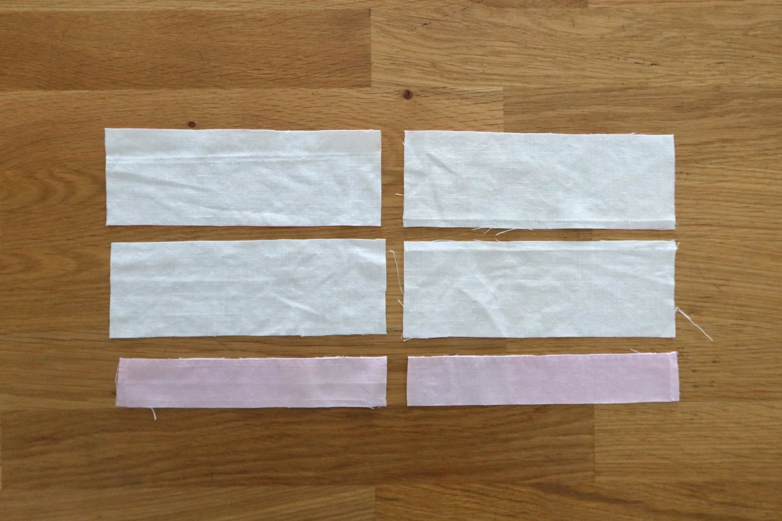 Iron seam allowances towards pockets. At this point, you can add lightweight interfacing to your pieces. If you are working with a lightweight cotton, I recommend interfacing all pieces. If you fabric is a bit thicker, you can choose to interface just the full body pieces and not the pockets. My fabric is very lightweight so I am adding lightweight interfacing to all pieces of my wallet.
